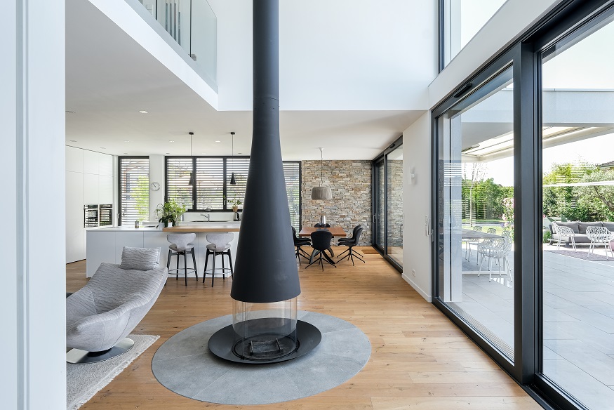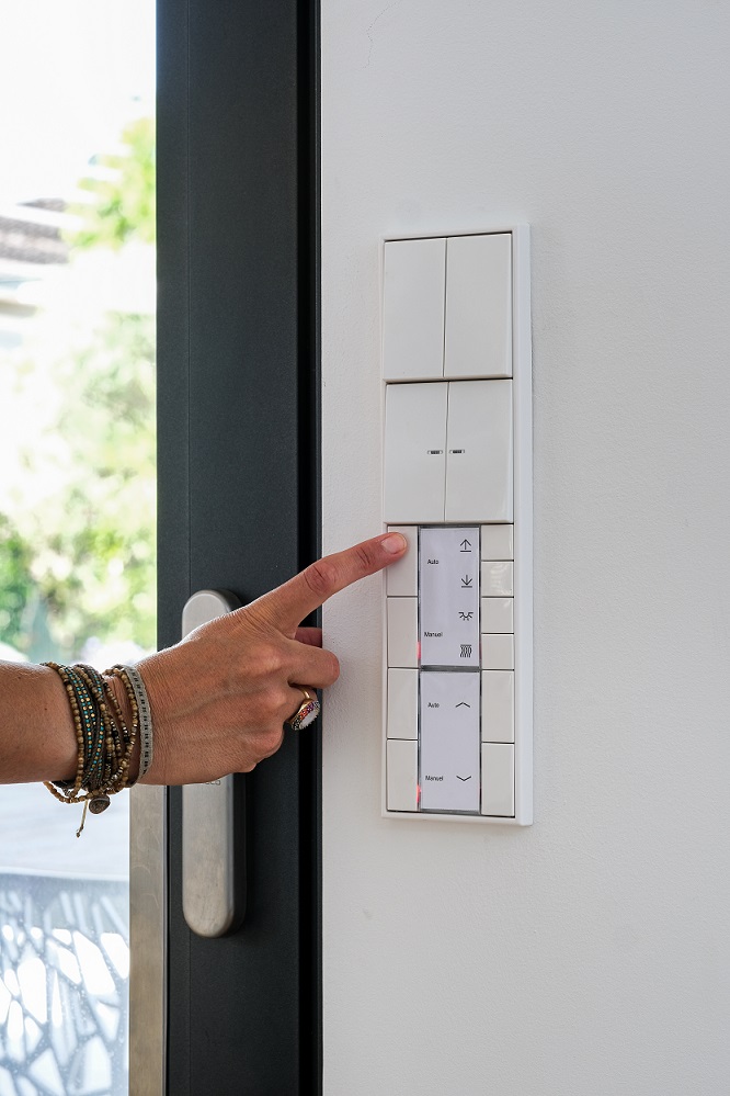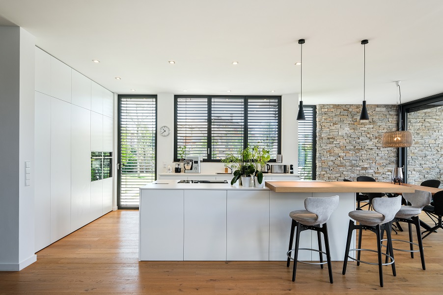 Dans le séjour ouvert sur la cuisine, d’immenses baies vitrées sont équipées de brise-soleil orientables (BSO). Comme l’ensemble des fenêtres de la villa, ces BSO sont motorisés et pilotables depuis des tablettes de centralisation JUNG à chaque étage. Elles permettent aux occupants de contrôler facilement :