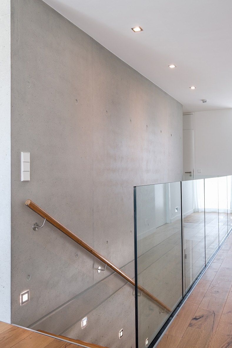 À l’intérieur, le béton apparent continue d’affirmer le caractère robuste de la maison. Dans la majestueuse montée d’escalier, des spots encastrés dans les murs ont été installés en amont de la réalisation, apportant une lumière douce et guidant le passage en toute sécurité tout en soulignant la pureté des lignes architecturales.