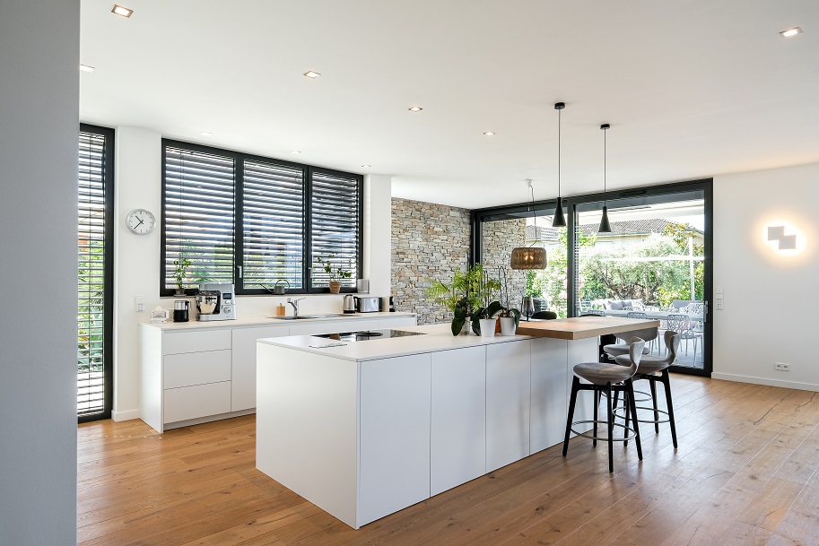 Dans le séjour ouvert sur la cuisine, d’immenses baies vitrées sont équipées de brise-soleil orientables (BSO). Comme l’ensemble des fenêtres de la villa, ces BSO sont motorisés et pilotables depuis des tablettes de centralisation JUNG à chaque étage. Elles permettent aux occupants de contrôler facilement :