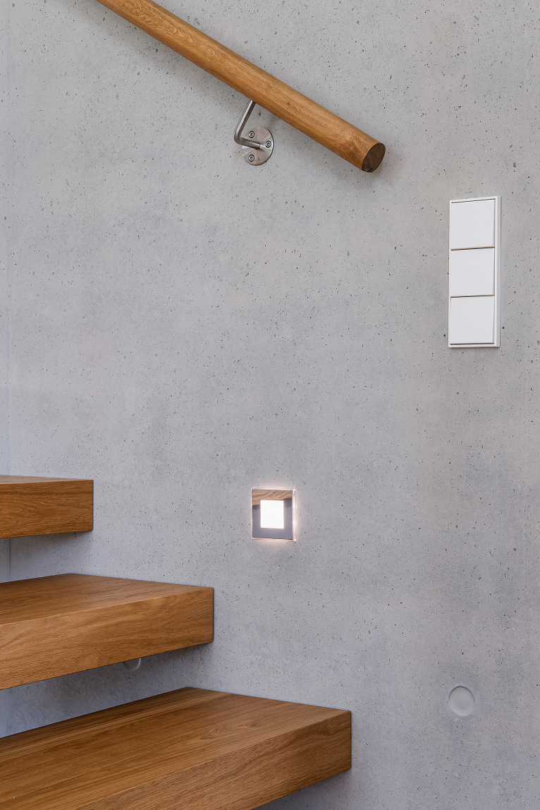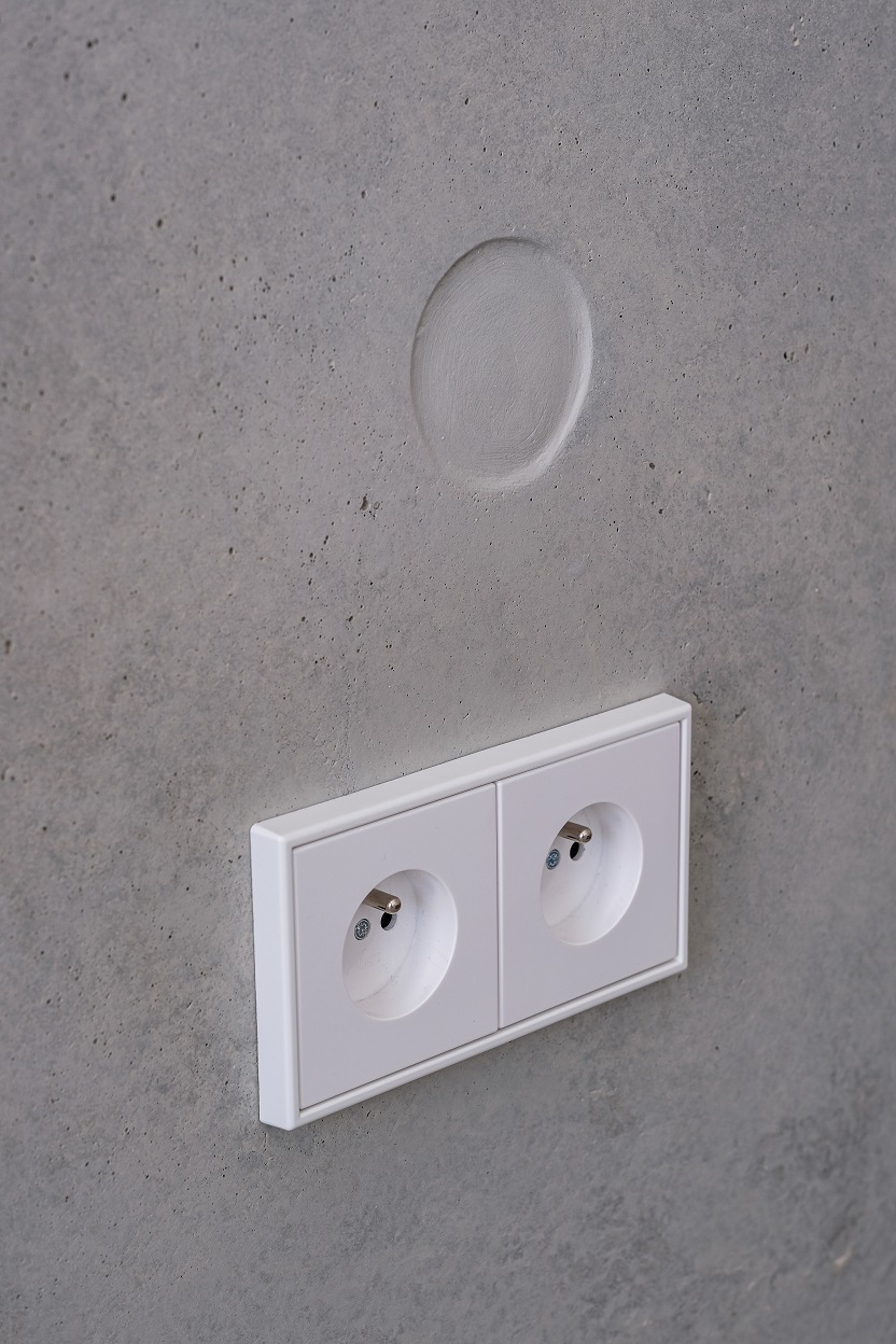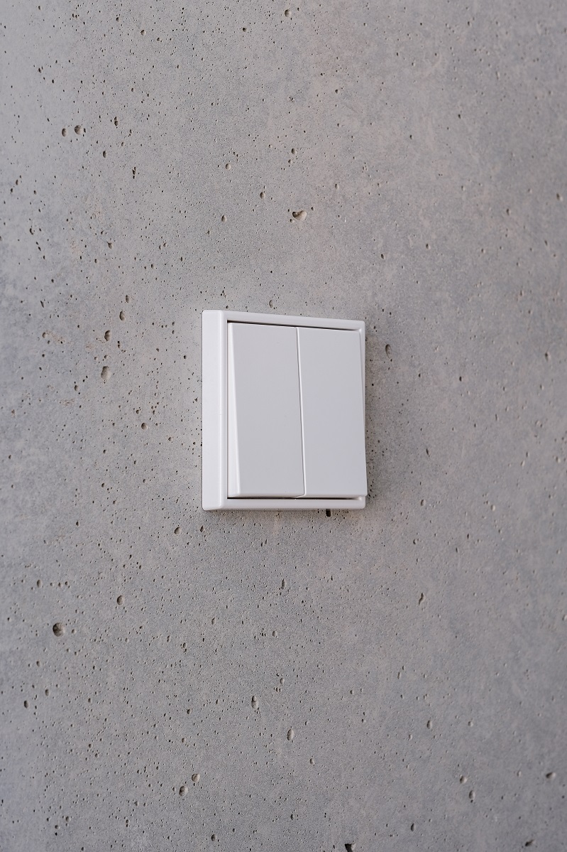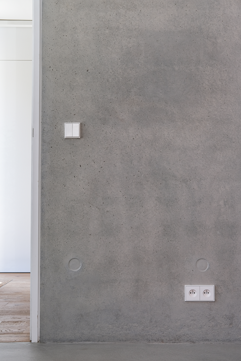 Les interrupteurs et prises JUNG au design épuré viennent compléter cet univers minimaliste et brut, tout en garantissant une ergonomie et une fiabilité optimales.